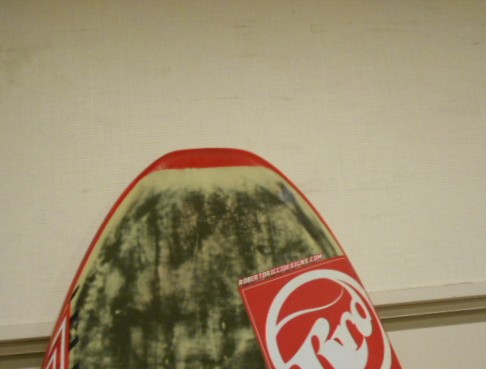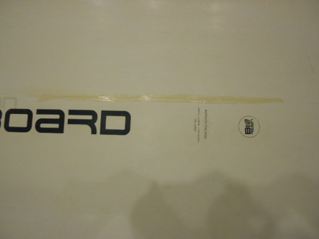 ![]() ノーズ・デッキ・テイルは修理しました。 小傷は多く、紫外線硬化樹脂も数点付けてあります。 大変丁寧に作ってあるボードのようで、ノーズパンチ によるひび割れが出来ても水の浸入はありません。 店長愛用ボードで、ジャパンサーキットで使用して いました |